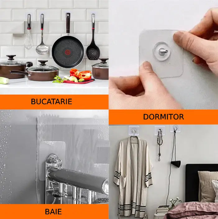 Cârlige autoadezive - se montează în câteva secunde pe orice suprafață netedă, fără găuri sau unelte!