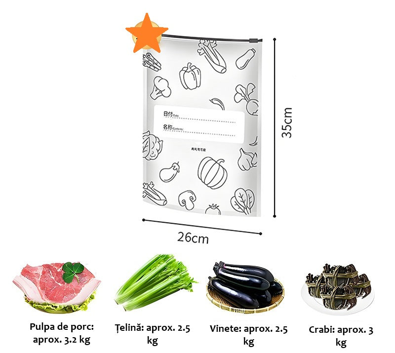 Aceste pungi țin mâncarea ferită de aer, păstrând savoarea zile întregi. Perfecte pentru frigider sau congelator