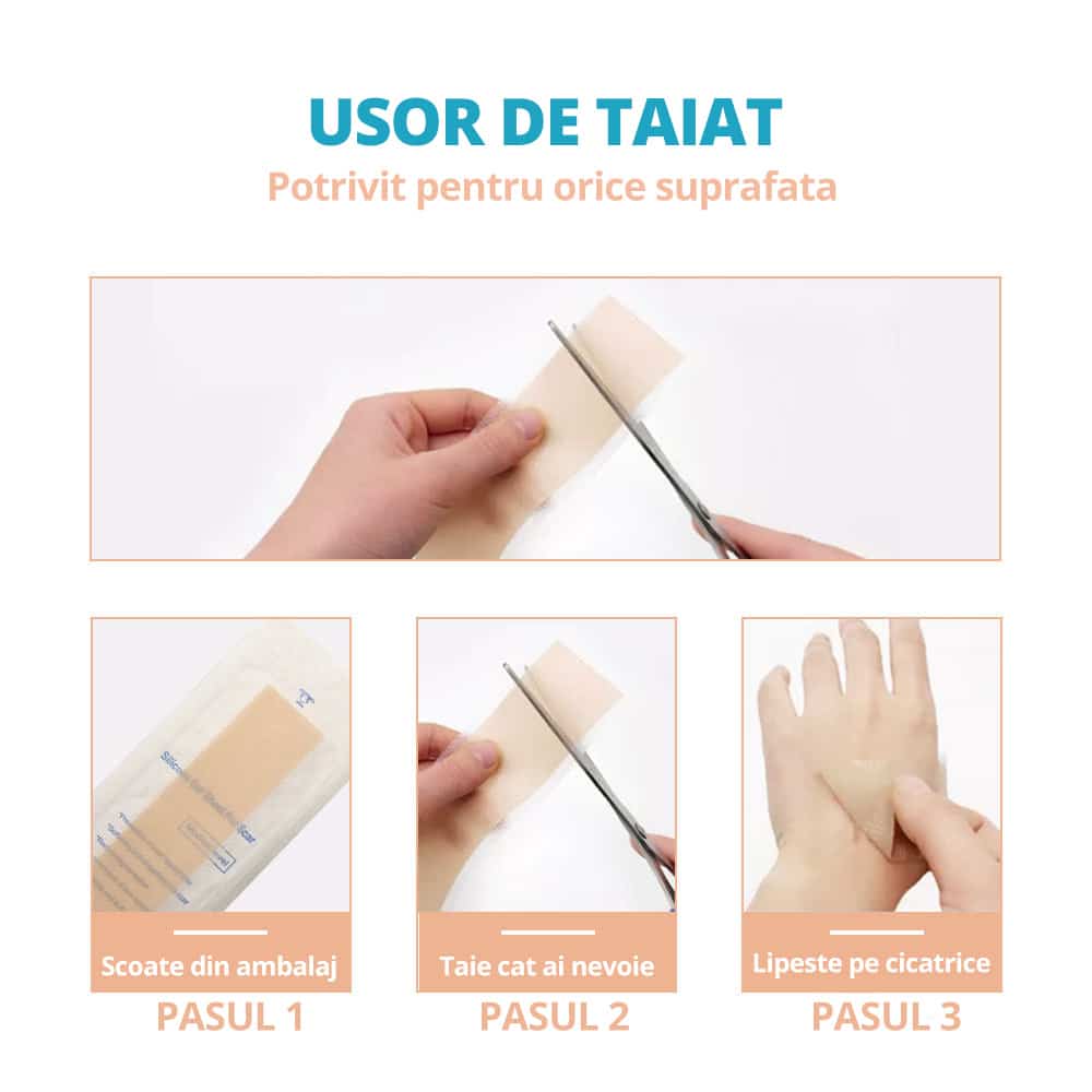 - Sigur, rapid si eficient – elimina cicatriciile existente in 3-6 luni si cele noi in 8 saptamani. Aceste benzi adezive din silicon, fara medicamente, sunt moi, flexibile si respirabile. Cel mai important, sunt sigure si confortabile pentru pielea fragila.